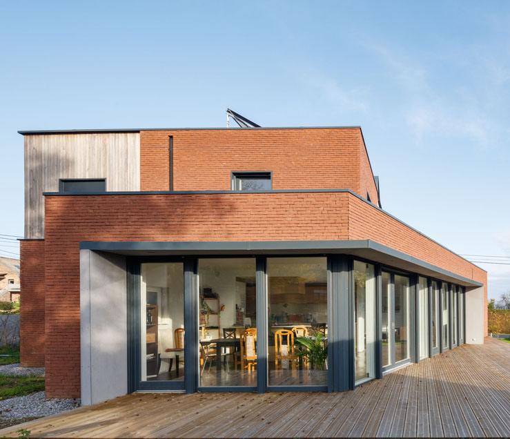 ECette nouvelle construction en bois s’articule sur le jardin. La façade arrière se marque en pointe, et des lignes répétées cadencent son esprit. Cette cadence a permis aux architectes d’intégrer différentes menuiseries en un bel ensemble vitré, menuiseries qui ont chacune une fonction, et surtout d’intégrer différents accès vers le jardin à partir des grands espaces de vie.